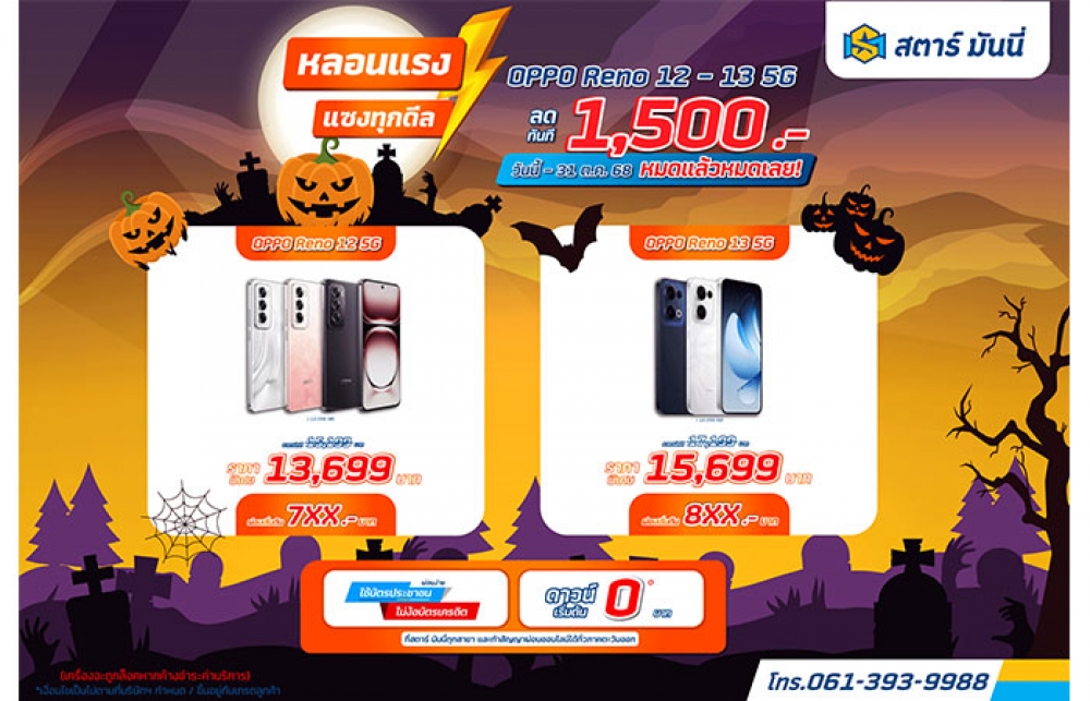 บมจ.สตาร์ มันนี่ (STARM) เสิร์ฟโปรแรงรับฮาโลวีนแบบไม่กลัวผี! ออกแคมเปญเอาใจสายช้อปมือถือ เพียงซื้อ OPPO Reno 12 หรือ Reno 13 5G รับส่วนลดทันที 1,500 บาท แถมโปรสุดใจดี “ดาวน์ 0 บาท* รับเครื่องกลับบ้านได้เลย” แคมเปญนี้จัดเต็มตั้งแต่วันนี้ถึง 31 ต.ค. 2568 ทุกสาขาของ STARM พร้อมเปิดช่องทาง ทำสัญญาผ่อนออนไลน์ สำหรับลูกค้าภาคตะวันออก สะดวก รวดเร็ว ไม่ต้องเดินทาง...โปรแรงช่วงเทศกาลแบบนี้ คาดช่วยเพิ่มยอดขายมือถือ และหนุนยอดปล่อยสินเชื่อให้โตต่อเนื่องในโค้งสุดท้ายแน่นอนคร้า!!