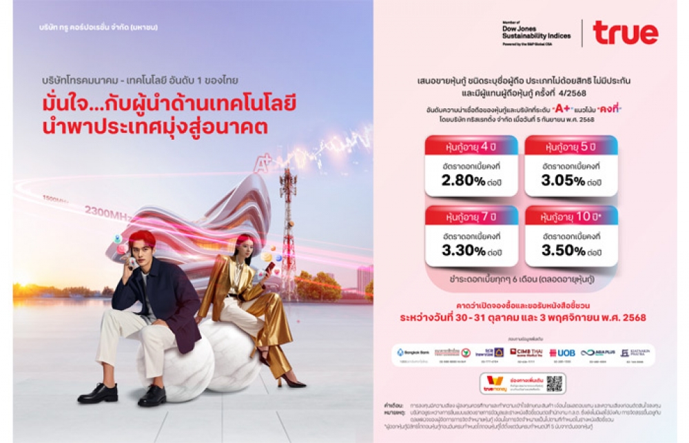 เมื่อวันที่ 20 ตุลาคม 2568 นางสาวยุภา ลีวงศ์เจริญ หัวหน้าคณะผู้บริหารด้านการเงิน (ร่วม) บริษัท ทรู คอร์ปอเรชั่น จำกัด (มหาชน) หรือ TRUE เปิดเผยว่า บริษัทมุ่งสร้างเสถียรภาพทางการเงิน ควบคู่กับการเติบโตอย่างต่อเนื่องและยั่งยืน ด้วยการออกหุ้นกู้ใหม่ 4 ชุด อายุตั้งแต่ตั้งแต่ 4 ปี ถึง 10 ปี มอบผลตอบแทนที่มั่นคงและสม่ำเสมอ เป็นโอกาสดีที่จะล็อคผลตอบแทนก่อนที่อัตราดอกเบี้ยจะลดลงพร้อมเปิดโอกาสให้นักลงทุนได้ร่วมเป็นส่วนหนึ่งของการเติบโตในระยะยาวของทรู โดยการออกหุ้นกู้ครั้งนี้เป็นส่วนหนึ่งของการบริหารโครงสร้างทางการเงินให้มีประสิทธิภาพยิ่งขึ้น พร้อมเสริมศักยภาพในการขยายธุรกิจและนวัตกรรมในอนาคต หุ้นกู้ทรูถือเป็นโอกาสการลงทุนที่โดดเด่น มั่นคง ให้ผลตอบแทนที่ดี พร้อมก้าวไปกับองค์กรโทรคมนาคมเทคโนโลยีชั้นนำของประเทศ ที่ได้รับความไว้วางใจจากนักลงทุนมาโดยตลอด