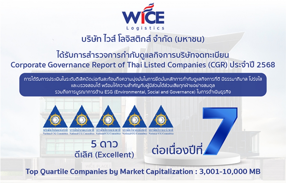 เมื่อวันที่ 30 ตุลาคม 2568 นายชูเดช คงสุนทร กรรมการผู้จัดการ ส่วนงานพัฒนาธุรกิจกลุ่มบริษัท บริษัท ไวส์ โลจิสติกส์ จำกัด (มหาชน) หรือ WICE ผู้ให้บริการโลจิสติกส์ระหว่างประเทศแบบครบวงจร เปิดเผยว่า บริษัทฯ ได้รับคะแนนการประเมินการกำกับดูแลกิจการในระดับ 5 ดาว หรือ “ดีเลิศ” (Excellent CG Scoring) โดยถูกจัดให้อยู่ในกลุ่ม “Top Quartile” หรือ กลุ่มที่มีผลการประเมินดีที่สุดใน 25% แรกของกลุ่มบริษัทจดทะเบียนที่มีมูลค่าหลักทรัพย์ตามราคาตลาด (Market Capitalization) ที่ 3,001 – 10,000 ล้านบาท จากสมาคมส่งเสริมสถาบันกรรมการบริษัทไทย (IOD) โดยการสนับสนุนจากตลาดหลักทรัพย์แห่งประเทศไทย และ สำนักงานคณะกรรมการกำกับหลักทรัพย์และตลาดหลักทรัพย์ (ก.ล.ต.) ซึ่งได้ดำเนินการสำรวจการกำกับดูแลกิจการของบริษัทจดทะเบียนไทย ประจำปี 2568 (Corporate Governance Report of Thai Listed Companies 2025 : CGR) โดยใช้หลักเกณฑ์ในการประเมินที่พัฒนาจากหลักการกำกับดูแลกิจการที่ดีขององค์การเพื่อความร่วมมือและการพัฒนาทางเศรษฐกิจ (OECD)