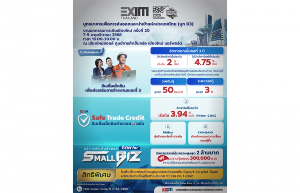 นิวส์ คอนเน็คท์ - ธนาคารเพื่อการส่งออกและนำเข้าแห่งประเทศไทย (EXIM BANK) จัดเต็มบริการทางการเงิน พร้อมโปรโมชันพิเศษ ในงานมหกรรมการเงินเชียงใหม่ ครั้งที่ 20 (Money Expo 2025 Chiang Mai) ระหว่างวันศุกร์ที่ 7-วันอาทิตย์ที่ 9 พฤศจิกายน 2568 ณ บูท D3 เชียงใหม่ฮอลล์ ศูนย์การค้าเซ็นทรัล เชียงใหม่ แอร์พอร์ต ภายใต้แนวคิด “Empowering Toward a Sustainable Wealth เสริมพลัง เพื่อสร้างความมั่งคั่งอย่างยั่งยืน”