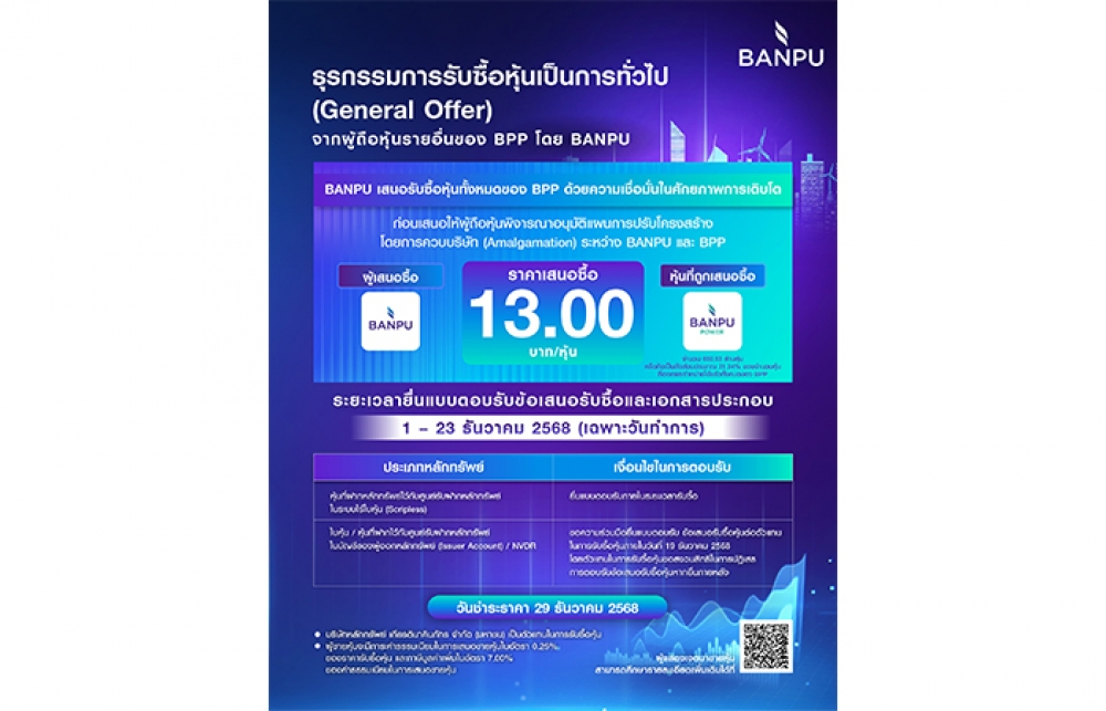 นิวส์ คอนเน็คท์ - BANPU เสนอรับซื้อหุ้นทั้งหมดจากผู้ถือหุ้นรายอื่นของ BPP เป็นการทั่วไป ที่ราคา 13.00 บาทต่อหุ้น ก่อนผู้ถือหุ้นพิจารณาอนุมัติธุรกรรมควบบริษัท เปิดให้ผู้ถือหุ้นรายอื่นของ BPP ตอบรับข้อเสนอรับซื้อหุ้นเป็นระยะเวลา 15 วันทำการ ตั้งแต่วันที่ 1 - 23 ธ.ค. 68 เฉพาะวันทำการ