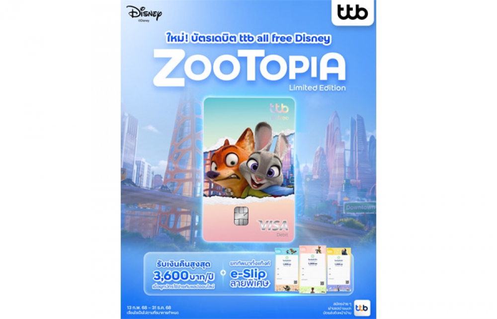 นอกจากนี้ ยังคงอัดแน่นด้วยสิทธิประโยชน์ครอบคลุมการใช้จ่ายทุกหมวด ทุกไลฟ์สไตล์ ทั้งกิน ดื่ม ช้อปปิ้ง ท่องเที่ยว และความบันเทิง ตอกย้ำบัตรเดบิต ทีทีบี ออลล์ฟรี ดิสนีย์ บัตรเดบิตที่ยืนหนึ่งเรื่องความคุ้มค่ากับทุกการใช้จ่าย ลูกค้าสามารถสมัคร บัตรเดบิต ทีทีบี ออลล์ฟรี ดิสนีย์ ลายใหม่ “Zootopia Limited Edition” ได้ตั้งแต่วันที่ 18 พ.ย. 2568 ผ่านแอป ทีทีบี ทัช เว็บไซต์ทีทีบี หรือที่ทีทีบีทุกสาขาทั่วประเทศ เพียงไม่กี่ขั้นตอนก็รับดีไซน์ลิมิเต็ดและสิทธิประโยชน์ครบถ้วน ดูรายละเอียดเพิ่มเติมได้ที่