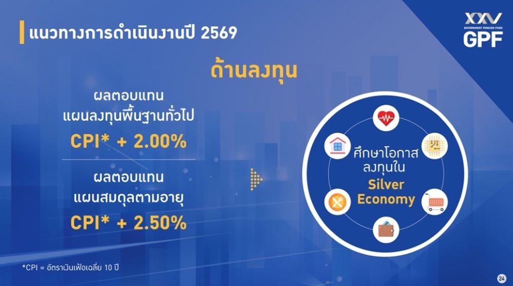 ส่วนแผนการดำเนินงานในปี 2569 กบข. จะเดินหน้าศึกษาโอกาสการลงทุนใหม่ผ่านโครงการนำร่อง ที่อยู่อาศัยสำหรับผู้สูงอายุ (Senior Housing Sandbox) และศึกษาโอกาสลงทุนในเศรษฐกิจสูงวัย (Siver Economy) รวมถึงกระตุ้นให้สมาชิกออมเงินเพิ่มอย่างต่อเนื่อง ควบคู่กับการส่งเสริมให้สมาชิกเลือกแผนการลงทุนที่เหมาะสมกับช่วงอายุ และเป้าหมายทางการเงินของตนเอง พร้อมพัฒนากลยุทธ์การลงทุนให้สามารถสร้างผลตอบแทนในระยะยาว โดยมีแผนการลงทุนและสินทรัพย์ที่กำหนดผลตอบแทนให้ชนะอัตราเงินเฟ้อเฉลี่ย 10 ปี บวก 2-3% ตามเป้าหมายของสมาชิก เพื่อเสริมสร้างความมั่นคงทางการเงิน ให้สมาชิกสามารถดำรงชีวิตหลังเกษียณได้อย่างมีสุข