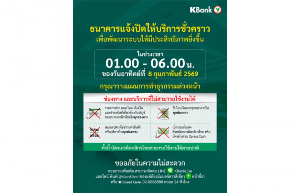กสิกรไทย แจ้งปิดปรับปรุงระบบชั่วคราว 8 ก.พ. 69