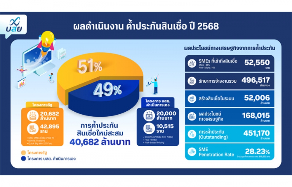 เมื่อวันที่ 15 กุมภาพันธ์ 2569 ดร.สิทธิกร ดิเรกสุนทร กรรมการและผู้จัดการทั่วไป บรรษัทประกันสินเชื่ออุตสาหกรรมขนาดย่อม (บสย.) เปิดเผยว่า ผลดำเนินงานปี 2568 บสย. มียอดค้ำประกันสินเชื่อ 40,682 ล้านบาท ภายใต้ 2 โครงการหลัก ได้แก่ โครงการตามมาตรการรัฐ ยอดอนุมัติ 20,682 ล้านบาท คิดเป็น 51% ของยอดค้ำประกัน และ โครงการที่ บสย. ดำเนินการเอง ยอดอนุมัติ 20,000 ล้านบาท คิดเป็น 49% ของยอดค้ำประกัน ช่วย SMEs เข้าถึงสินเชื่อ 52,550 ราย เป็นผู้ประกอบการรายย่อย (Micro SMEs) 86% ค้ำประกัน เฉลี่ย 2 แสนบาทต่อราย อีก 14% เป็น SMEs ทั่วไป ค้ำประกันเฉลี่ย 4.56 ล้านบาทต่อราย ก่อให้เกิดสินเชื่อในระบบสถาบันการเงิน 52,006 ล้านบาท รักษาการจ้างงาน 496,517 ตำแหน่ง และสร้างผลประโยชน์ทางเศรษฐกิจได้มากกว่า 168,015 ล้านบาท