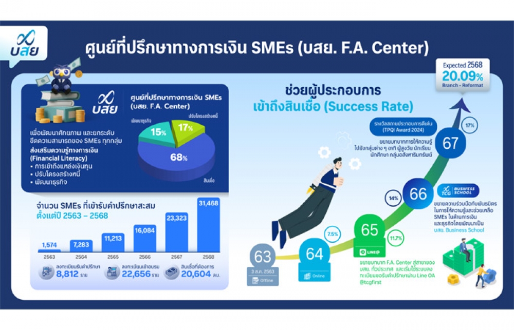 นอกจากนี้ บสย. ยังให้ความสำคัญกับการพัฒนาศักยภาพ SMEs เพื่อสร้างความเข้มแข็งและเติบโตอย่างยั่งยืน ผ่าน ศูนย์ที่ปรึกษาทางการเงิน SMEs (บสย. F.A. Center) เพื่อเพิ่มโอกาส SMEs สามารถเข้าถึงสินเชื่อในระบบได้ง่ายขึ้น โดยตั้งแต่เปิดให้บริการในเดือนสิงหาคม 2563 – 31 ธันวาคม 2568 ให้ความรู้ทางการเงินแก่ SMEs รวม 31,468 ราย แบ่งเป็นให้คำปรึกษา 8,812 ราย และการอบรม 22,656 ราย คิดเป็นความต้องการสินเชื่อรวม 20,604 ล้านบาท โดยสามารถช่วย SMEs เข้าถึงสินเชื่อในระบบ (Success rate) ได้มากกว่า 20%