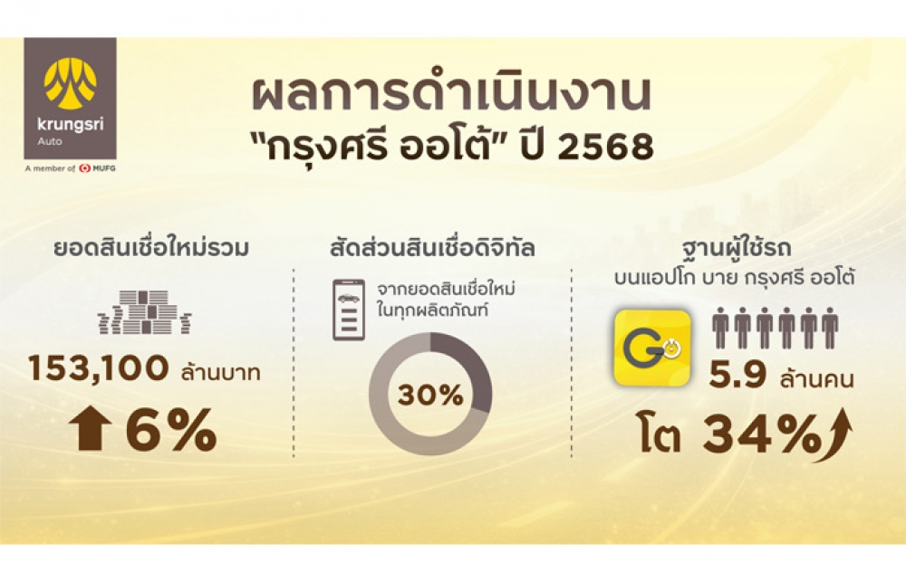 อย่างไรก็ตาม ในปี 2568 กรุงศรี ออโต้ ยังคงครองความเป็นผู้นำตลาดสินเชื่อยานยนต์ ด้วยยอดสินเชื่อใหม่รวม 153,100 ล้านบาท เติบโต 6% จากปีก่อนหน้า โดยตัวเลขดังกล่าวได้รับแรงหนุนจากการเร่งทรานส์ฟอร์มสู่ดิจิทัลอย่างจริงจัง ผ่านนวัตกรรมสินเชื่อยานยนต์ดิจิทัลบนแอป โก บาย กรุงศรี ออโต้ รวมถึงการเชื่อมโยงบริการดิจิทัลกับพันธมิตรในอีโคซิสเต็ม ซึ่งส่งผลให้สัดส่วนสินเชื่อใหม่ผ่านช่องทางดิจิทัลพุ่งแตะ 30% ของยอดสินเชื่อใหม่ทั้งหมดในปีที่ผ่านมา