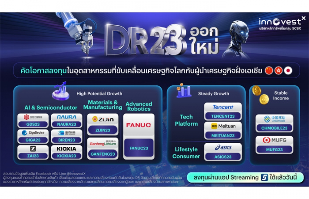 เมื่อวันที่ 17 มีนาคม 2569 นายพยนต์ พงศาวรี Chief Investment Officer บริษัทหลักทรัพย์ อินโนเวสท์ เอกซ์ จำกัด (InnovestX) เรือธงด้านการลงทุนภายใต้กลุ่มเอสซีบีเอกซ์ (SCBX Group) เปิดเผยว่า DR23 ชุดใหม่สะท้อนโอกาสลงทุนในอุตสาหกรรมสำคัญของเศรษฐกิจโลก ตั้งแต่เทคโนโลยี AI และเซมิคอนดักเตอร์ โครงสร้างพื้นฐานดิจิทัล ไปจนถึงวัตถุดิบสำหรับพลังงานสะอาด และธุรกิจผู้บริโภคยุคใหม่ ในช่วงที่เศรษฐกิจโลกกำลังเข้าสู่รอบใหม่ของการลงทุนด้านเทคโนโลยีและโครงสร้างพื้นฐานดิจิทัล โดยเฉพาะกระแส AI เซมิคอนดักเตอร์ และระบบอัตโนมัติ ที่เป็นหัวใจของเศรษฐกิจโลก ขณะเดียวกัน เศรษฐกิจเอเชียยังคงเป็นศูนย์กลางของห่วงโซ่อุปทานเทคโนโลยี และมีตลาดผู้บริโภคขนาดใหญ่