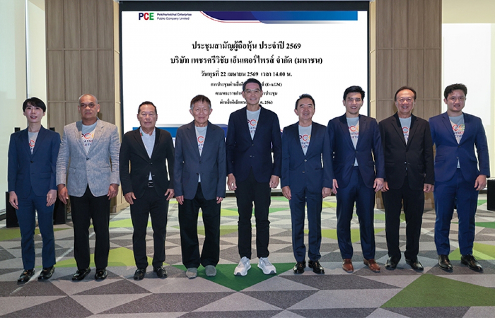 นายชนิตร ชาญชัยณรงค์ (กลาง) ประธานกรรมการ, นายประกิต ประสิทธิ์ศุภผล (ที่ 4 จากซ้าย) ประธานเจ้าหน้าที่บริหารและกรรมการผู้จัดการใหญ่, นายพรพิพัฒน์ ประสิทธิ์ศุภผล (ที่ 3 จากขวา) รองกรรมการผู้จัดการสายงานกลยุทธ์และพัฒนาองค์กร, นายกีรติ ไชยะกุล (ที่ 1 จากซ้าย) ผู้อำนวยการอาวุโสสายงานบัญชีและการเงิน พร้อมด้วยทีมผู้บริหารและคณะกรรมการ บริษัท เพชรศรีวิชัย เอ็นเตอร์ไพรส์ จำกัด (มหาชน) (PCE) ร่วมกันถ่ายภาพหลังการประชุมสามัญผู้ถือหุ้นประจำปี 2569 ผ่านสื่ออิเล็กทรอนิกส์ (E-AGM) โดยที่ประชุมได้พิจารณาอนุมัติผ่านทุกวาระ พร้อมกับมีมติเป็นเอกฉันท์จ่ายปันผลจากผลการดำเนินงานงวดปี 2568 ในอัตรา 0.08 บาท/หุ้น กำหนดจ่ายในวันที่ 20 พฤษภาคม 2569 ทั้งนี้ บริษัทฯ เดินหน้าขยายกำลังการผลิตอย่างเต็มรูปแบบ ทั้ง โรงสกัดน้ำมันปาล์มดิบ เฟส 2 ซึ่งเริ่มผลิตเชิงพาณิชย์แล้ว ปัจจุบันสามารถรองรับผลปาล์มสดจากเกษตรกรได้สูงสุดรวม 150 ตันต่อชั่วโมง หรือ 3,600 ตันต่อวัน ส่วนบริษัท นิว ไบโอดีเซล จำกัด บริษัทในเครือ เป็นหนึ่งในผู้ผลิตไบโอดีเซลรายใหญ่ของประเทศ เดินหน้าผลิตไบโอดีเซล B100 เต็มกำลังการผลิต รองรับนโยบายภาครัฐและความต้องการที่สูงขึ้นอย่างต่อเนื่อง มุ่งสู่การเป็นผู้นำอุตสาหกรรมน้ำมันปาล์มครบวงจรระดับประเทศ โดยงานดังกล่าวจัดขึ้น ณ ห้องประชุมบริษัทฯ เมื่อเร็ว ๆ นี้