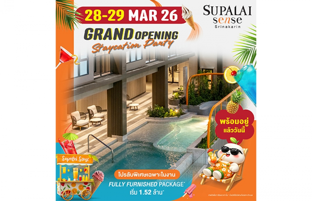 เมื่อวันที่ 16 มีนาคม 2569 บริษัท ศุภาลัย จำกัด (มหาชน) เปิดตัวโครงการใหม่ “ศุภาลัย เซนส์ ศรีนครินทร์” พร้อมข้อเสนอสุดพิเศษสำหรับผู้ที่กำลังมองหาที่อยู่อาศัยคุณภาพในราคาที่เข้าถึงได้ง่าย เตรียมพบกับดีลสุดเอกซ์คลูซีฟในงาน “GRAND OPENING STAYCATION PARTY” ชวนสัมผัสประสบการณ์การอยู่อาศัยรูปแบบใหม่ ที่ให้ความรู้สึกเหมือนได้พักผ่อนทุกวันที่กลับบ้าน ด้วยห้องพักดีไซน์โปร่ง โล่ง สบาย สไตล์รีสอร์ต ในราคาเริ่มต้นเพียง 1.52 ล้านบาท*