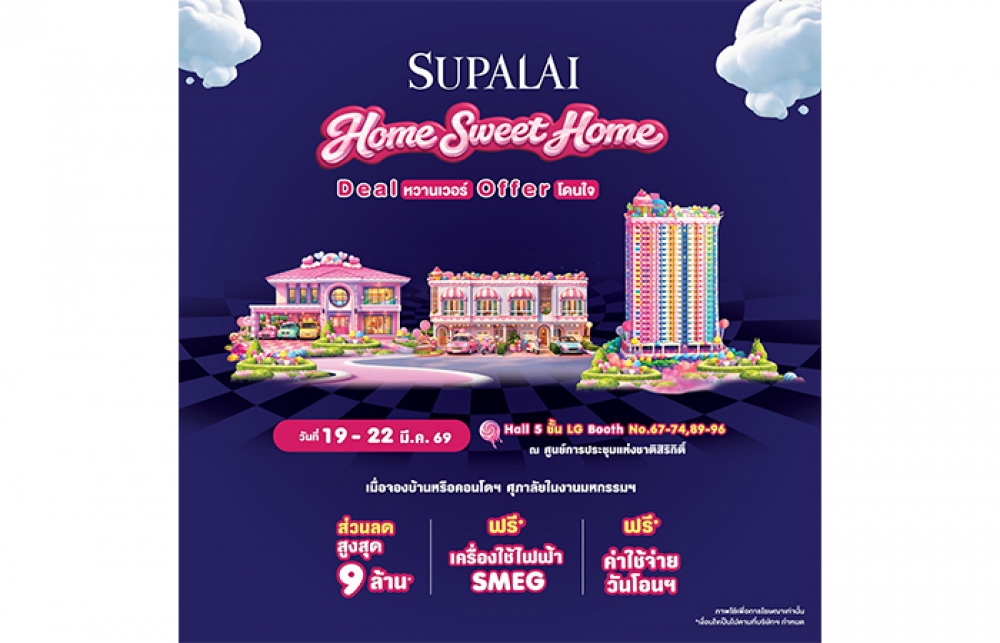 เมื่อวันที่ 19 มีนาคม 2569 บริษัท ศุภาลัย จำกัด (มหาชน) ชวนคนอยากมีบ้าน มาเติมเต็มความสุขกับแคมเปญสุดฟิน “SUPALAI HOME SWEET HOME” Deal หวานเวอร์ Offer โดนใจ ยกทัพบ้าน ทาวน์โฮม และคอนโดมิเนียมพร้อมอยู่กว่า 200 โครงการ ฮอตทุกระดับราคา ทำเลยอดฮิต บุกงานมหกรรมบ้านและคอนโดฯ ครั้งที่ 49 พร้อมดีลดีหวานเวอร์ ส่วนลดสูงสุด 9,000,000 บาท* รับฟรี! เครื่องใช้ไฟฟ้า SMEG* และฟรี! ค่าใช้จ่ายวันโอนฯ* ฟินต่อเนื่องดีลพิเศษ Shock Price! เริ่ม 990,000 บาท* จัดเต็มเพียง 4 วันเท่านั้น! 19-22 มีนาคม 2569 ณ ศูนย์การประชุมแห่งชาติสิริกิติ์ Hall 5 ชั้น LG บูธที่ 67-74/89-96 (*เงื่อนไขเป็นไปตามที่บริษัทฯ กำหนด)