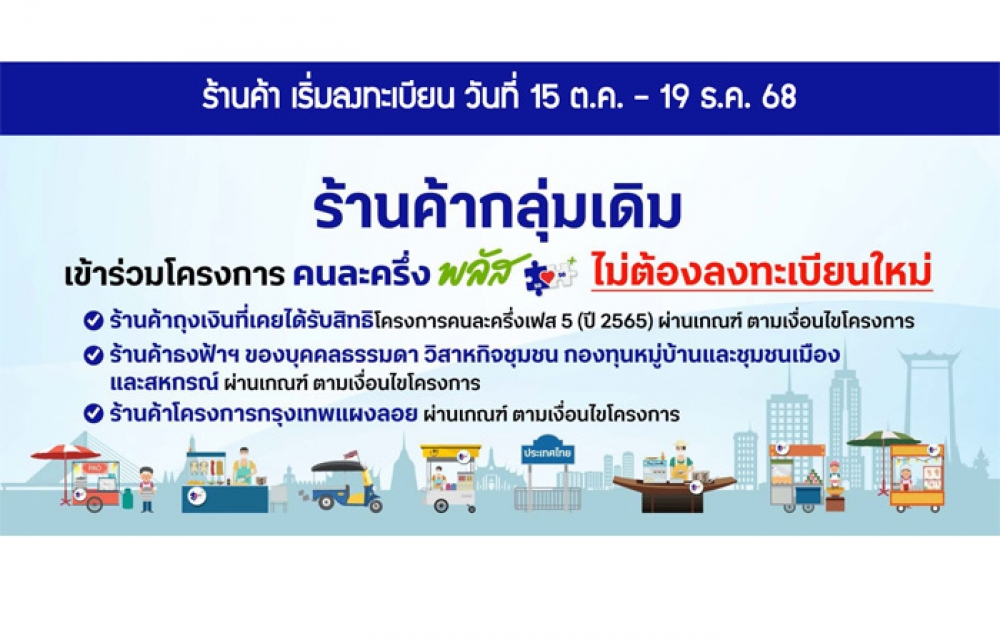 นิวส์ คอนเน็คท์ – ผู้สื่อข่าวรายงานว่า โครงการคนละครึ่ง พลัส (โครงการฯ) จะมีการเปิดลงทะเบียนผู้ประกอบการร้านค้าในวันพุธที่ 15 ต.ค. 2568 เป็นวันแรก และต่อเนื่องไปจนถึงวันที่ 19 ธ.ค. 2568 โดยมีรายละเอียดประเภทร้านค้า และการลงทะเบียนร้านค้า ดังนี้