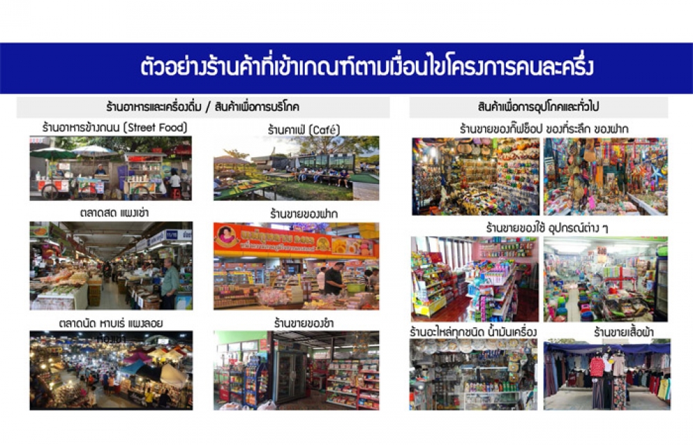 1.1 เป็นผู้ประกอบการร้านค้าอาหาร เครื่องดื่ม และสินค้าทั่วไป ที่มีสัญชาติไทย (ผู้ประกอบการร้านค้าฯ) ดังนี้ 1.1.1 ผู้ประกอบการที่ไม่ใช่นิติบุคคล หรือ 1.1.2 ร้านค้าธงฟ้าราคาประหยัดพัฒนาเศรษฐกิจท้องถิ่น (ร้านค้าธงฟ้าฯ) ที่ไม่ใช่นิติบุคคล เว้นแต่เป็นร้านค้าธงฟ้าฯ ของสหกรณ์ตามพระราชบัญญัติสหกรณ์ พ.ศ. 2542 และที่แก้ไขเพิ่มเติม หรือ 1.1.3 ร้านค้าของกองทุนหมู่บ้านหรือกองทุนชุมชนเมืองตามพระราชบัญญัติกองทุนหมู่บ้านและชุมชนเมืองแห่งชาติ พ.ศ. 2547 (พ.ร.บ. กองทุนหมู่บ้านฯ) หรือ 1.1.4 ร้านค้าของวิสาหกิจชุมชนตามพระราชบัญญัติส่งเสริมวิสาหกิจชุมชน พ.ศ. 2548 และที่แก้ไขเพิ่มเติม (พ.ร.บ. ส่งเสริมวิสาหกิจชุมชนฯ) ทั้งนี้ ต้องไม่เป็นร้านค้าที่มีลักษณะเป็นร้านสะดวกซื้อที่เป็นธุรกิจแฟรนไชส์ และต้องมีการประกอบการที่สามารถตรวจสอบได้