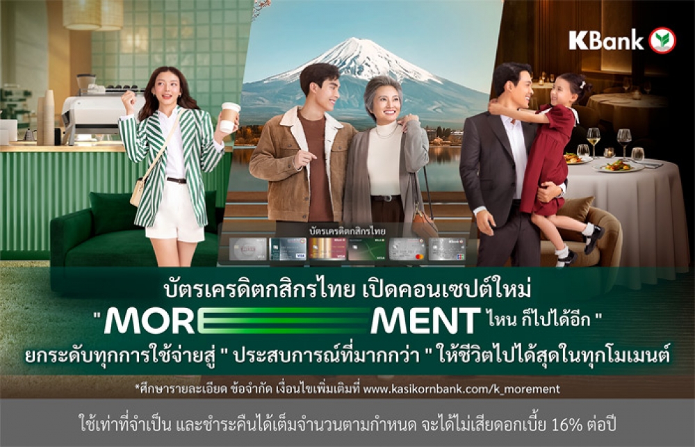 ขณะที่ยังยกระดับสู่ประสบการณ์ระดับเวิลด์คลาส ทั้งการท่องเที่ยว ร้านอาหาร และอีเวนต์พิเศษ เช่น บัตรเครดิตเดอะวิสดอมกสิกรไทย ยกระดับสิทธิพิเศษผ่านแคมเปญ “UP SPENDING, MORE PRIVILEGES” ได้แก่ สิทธิพักฟรีคืนที่ 4 ในโรงแรมระดับโลก กิจกรรม K-Curated Dining Experience สิทธิ 2 จ่าย 1 และแลก K Point รับเครดิตเงินคืนสูงสุด 15% ศึกษารายละเอียดเพิ่มเติมที่ www.kasikornbank.com/k_morement