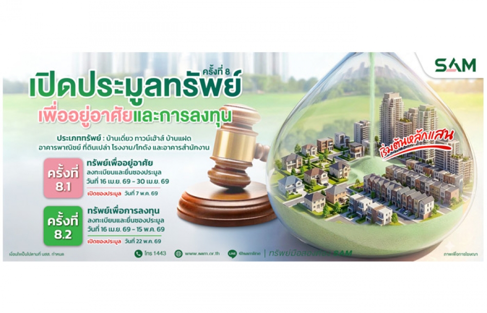 ทั้งนี้ ผู้สนใจเข้าร่วมประมูลสามารถลงทะเบียนและยื่นซองประมูล พร้อมเอกสารประกอบการ ประมูลที่กำหนดได้ที่สำนักงานใหญ่ SAM อาคารซันทาวเวอร์ส ถ.วิภาวดีรังสิต กรุงเทพฯ หรือสอบถามรายละเอียดเพิ่มเติมได้ที่ Call Center 1443 กด 2 และดูรายละเอียดทรัพย์สินได้ทางเว็บไซต์ที่