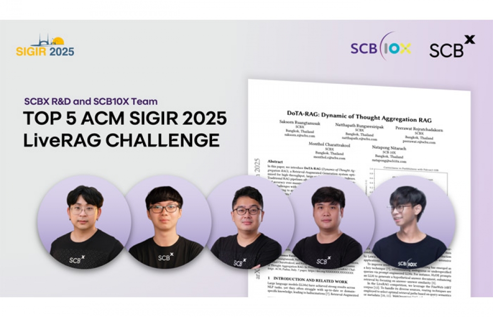 นิวส์ คอนเน็คท์ - SCBX ประกาศความสำเร็จ คว้าอันดับ 5 จาก 40 ทีมทั่วโลก โดยเป็นทีมจากภาคอุตสาหกรรมที่ทำคะแนนสูงสุดในการแข่งขันพัฒนาระบบ Retrieval-Augmented Generation (RAG) ภายในงาน ACM SIGIR 2025 งานประชุมวิชาการด้าน Information Retrieval อันดับหนึ่งของโลกที่จัดต่อเนื่องมากว่า 48 ปี โดย ACM SIGIR ถือเป็นเวทีประชุมวิชาการชั้นนำระดับโลกด้าน Information Retrieval ที่เป็นจุดกำเนิดของนวัตกรรมสำคัญ เช่น Search Engine ของ Google และ Recommendation System ที่ใช้ใน TikTok และแพลตฟอร์มดิจิทัลชั้นนำทั่วโลก ซึ่งการแข่งขันในปีนี้มีผู้เข้าร่วมจากมหาวิทยาลัยชั้นนำและบริษัทเทคโนโลยีระดับโลก อาทิ Carnegie Mellon University, New York University, Seoul National University, Amazon Web Service รวมถึงสตาร์ทอัพชั้นนำหลายแห่ง