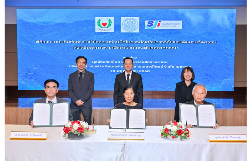 นิวส์ คอนเน็คท์ - นางกอบกาญจน์ วัฒนวรางกูร (นั่งกลาง) ประธานมูลนิธิกสิกรไทย ศาสตราจารย์ ดร.พรศักดิ์ ศรีอมรศักดิ์ (นั่งซ้าย) คณบดีคณะเภสัชศาสตร์ ปฏิบัติการแทนอธิการบดีมหาวิทยาลัยศิลปากร และนายธีระศักดิ์ วิกิตเศรษฐ์ (นั่งขวา) กรรมการผู้จัดการ บริษัท เอส แอนด์ เจ อินเตอร์เนชั่นแนล เอนเตอร์ไพรส์ จำกัด (มหาชน) ร่วมลงนามบันทึกความเข้าใจ ความร่วมมือในการส่งเสริมการวิจัยและพัฒนานวัตกรรมส่งเสริมสุขภาพจากพืชยาน่านในระดับอุตสาหกรรม ภายใต้แนวคิด พืชยาคืนป่า ซึ่งเป็นส่วนหนึ่งของโครงการน่านแซนด์บอกซ์ โดยความร่วมมือครั้งนี้มีความพิเศษคือ การยกระดับองค์ความรู้และนวัตกรรมจากงานวิจัยสู่ระดับอุตสาหกรรม โดยผสานจุดแข็งของสามภาคส่วน - ภาคสังคม ภาควิชาการ และภาคเอกชนชั้นนำระดับนานาชาติในอุตสาหกรรมสุขภาพและความงาม เพื่อสร้างมาตรฐานใหม่ของผลิตภัณฑ์สุขภาพจากพืชยาของไทย