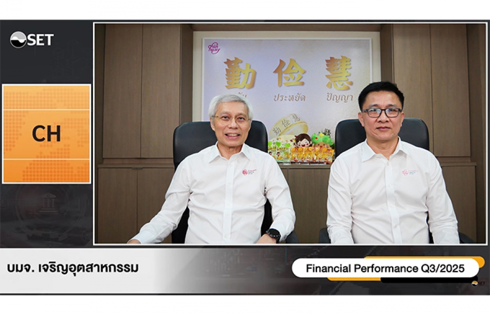 นายศักดา ศรีแสงนาม (ซ้าย) ประธานเจ้าหน้าที่บริหาร และ นายสรกฤช รอดทิม (ขวา) ประธานเจ้าหน้าที่สายงานการเงินและบัญชี บริษัท เจริญอุตสาหกรรม จำกัด (มหาชน) หรือ CH ให้ข้อมูลผลประกอบการงวด 9 เดือน ปี 2568 รายได้รวม 1,258.31 ล้านบาท กำไรสุทธิ 5.46 ล้านบาท พร้อมทิศทางธุรกิจไตรมาส 4/2568 แนวโน้มฟื้นตัวต่อเนื่อง จากการปรับกลยุทธ์ขยายตลาดไปยังกลุ่มประเทศโซนยุโรป และพัฒนาผลิตภัณฑ์ใหม่คุณภาพสูง รสชาติดี ต้นทุนเหมาะสม ในงานบริษัทจดทะเบียนพบผู้ลงทุน (Opportunity Day) จัดโดยตลาดหลักทรัพย์แห่งประเทศไทย