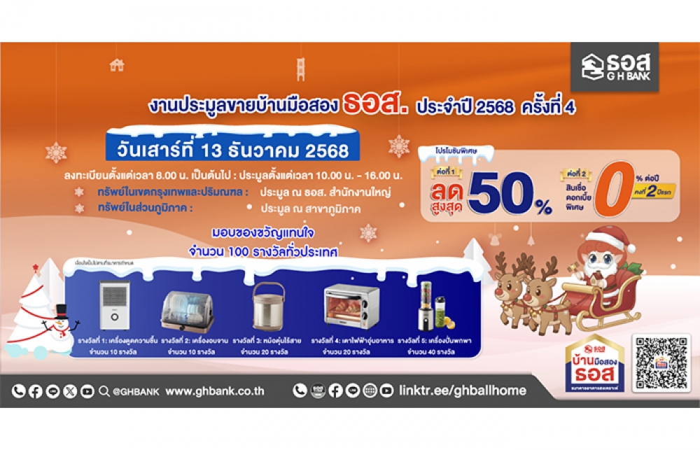 เมื่อวันที่ 8 ธันวาคม 2568 ธนาคารอาคารสงเคราะห์ (ธอส.) แจ้งว่า เพื่อเป็นการตอกย้ำพันธกิจ “ทำให้คนไทยมีบ้าน” ธอส จัดงานประมูลขายบ้านมือสอง ธอส. ประจำปี 2568 ครั้งที่ 4 ในวันเสาร์ที่ 13 ธันวาคม 2568 ระหว่างเวลา 10.00 - 16.00 น. คัดบ้านมือสอง คุณภาพดีทั่วประเทศกว่า 10,000 รายการ ทั้งบ้านเดี่ยว ทาวน์เฮ้าส์ บ้านแฝด ห้องชุด (คอนโดมิเนียม) อาคารพาณิชย์ และที่ดินเปล่า มาเปิดประมูลในราคาลดสูงสุด 50% จากราคาปกติ แบ่งเป็นทรัพย์ในกรุงเทพฯ และปริมณฑล จำนวน 1,200 รายการ โดยมีรายการทรัพย์ที่น่าสนใจ ได้แก่ ทาวน์เฮ้าส์ 2 ชั้น ขนาดเนื้อที่ 18.10 ตารางวา ในโครงการไลโออีลิทวัชรพล - สุขาภิบาล 5 เขตสายไหม กรุงเทพฯ ซึ่งเป็นทรัพย์ที่ตั้งอยู่บนทำเลศักยภาพ มีเส้นทางคมนาคมสะดวก อยู่ใกล้สถานีรถไฟฟ้าสายสีชมพูและสายสีเขียว ราคาประมูลเริ่มต้น 2,520,000 บาท