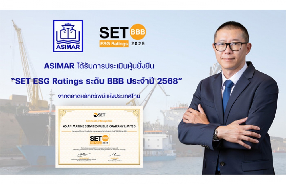 นิวส์ คอนเน็คท์ - บริษัท เอเชียน มารีน เซอร์วิสส์ จำกัด (มหาชน) หรือ ASIMAR ได้รับการประเมินด้านความยั่งยืนจาก SET ESG Ratings ในระดับ “BBB” ประจำปี 2568 ซึ่งจัดทำโดย ตลาดหลักทรัพย์แห่งประเทศไทย การประเมินดังกล่าวสะท้อนถึงแนวทางการดำเนินธุรกิจของบริษัทที่ให้ความสำคัญกับการบูรณาการมิติด้านสิ่งแวดล้อม สังคม และการกำกับดูแลกิจการ (Environmental, Social and Governance: ESG) เข้ากับกระบวนการบริหารจัดการและการดำเนินงานขององค์กร ตามหลักเกณฑ์และมาตรฐานที่ตลาดหลักทรัพย์แห่งประเทศไทยกำหนด