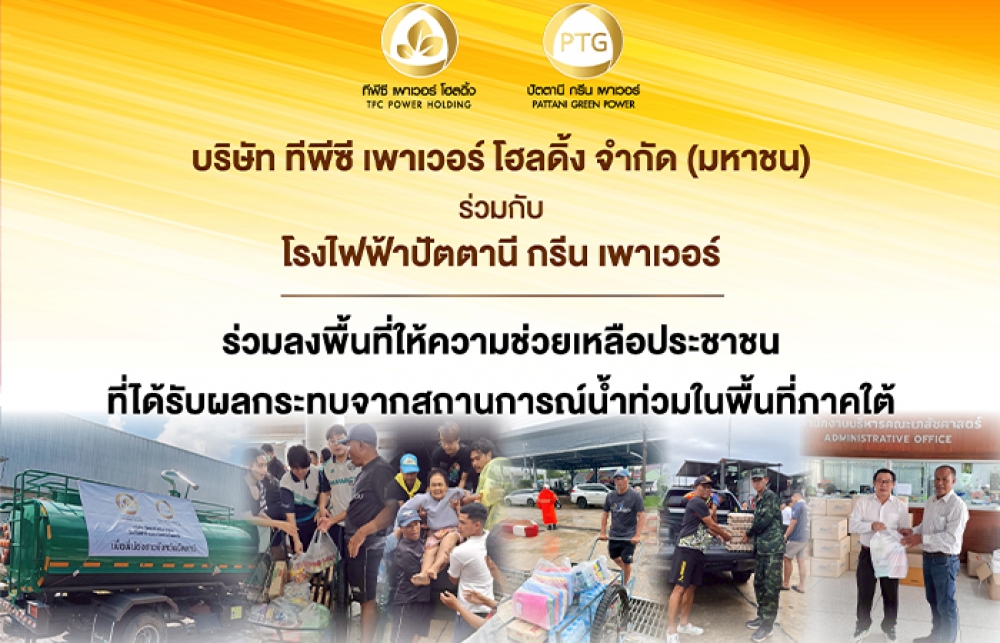 บริษัท ทีพีซี เพาเวอร์ โฮลดิ้ง จำกัด (มหาชน) (TPCH) ร่วมกับ โรงไฟฟ้าปัตตานี กรีน เพาเวอร์ เดินหน้าช่วยเหลือผู้ประสบภัยน้ำท่วมในพื้นที่ภาคใต้ โดยสนับสนุนรถขนน้ำเพื่อฉีดล้าง ทำความสะอาดบ้านเรือนและพื้นที่สาธารณะในอำเภอหาดใหญ่ จังหวัดสงขลา และอำเภอหนองจิก จังหวัดปัตตานี พร้อมจัดทีมจิตอาสาลงพื้นที่ส่งมอบอาหาร น้ำดื่ม และสิ่งของเครื่องใช้ที่จำเป็นในชีวิตประจำวัน รวมทั้งมอบยาและเวชภัณฑ์ ให้แก่มหาวิทยาลัยสงขลานครินทร์ เพื่อนำไปกระจายสู่พี่น้องประชาชนผู้ประสบอุทกภัย ทั้งนี้ ถือเป็นอีกหนึ่งความตั้งใจของบริษัทฯ ในการบรรเทาความเดือดร้อนและสร้างกำลังใจให้กับพี่น้องชาวใต้ในยามวิกฤติ กิจกรรมดังกล่าวจัดขึ้นเมื่อเร็วๆ นี้