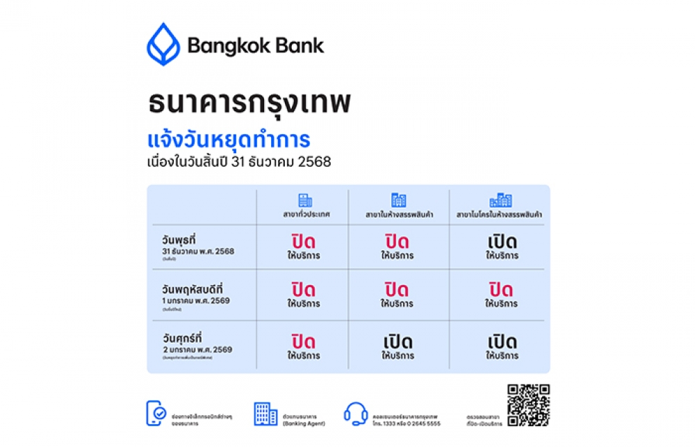 ทั้งนี้ในช่วงวันหยุดเทศกาลปีใหม่ วันที่ 31 ธันวาคม 2568 ลูกค้าสามารถใช้บริการทางการเงินของธนาคารกรุงเทพ ได้ ณ สาขาไมโครในห้างสรรพสินค้า และในวันที่ 2 มกราคม 2569 ณ สาขาในห้างสรรพสินค้า และสาขาไมโครในห้างสรรพสินค้า (ตรวจสอบรายชื่อสาขาที่เปิดให้บริการได้ที่ เว็บไซต์ www.bangkokbank.com) รวมถึงบริการตัวแทนธนาคารที่รองรับธุรกรรมในการฝาก-ถอนเงินสดและยืนยันตัวตน โดยมีจุดให้บริการรวม 162,000 แห่งทั่วประเทศ ซึ่งเปิดให้บริการตามปกติทุกวัน ณ จุดบริการต่างๆ ดังนี้