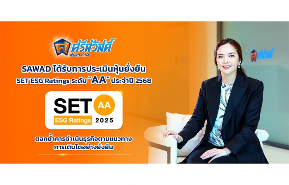 นิวส์ คอนเน็คท์ - บริษัท ศรีสวัสดิ์ คอร์ปอเรชั่น จำกัด (มหาชน) หรือ SAWAD ได้รับการประเมินหุ้นยั่งยืน SET ESG Ratings ระดับ “AA” ในกลุ่มธุรกิจการเงิน (Financials) ประจำปี 2568 จัดขึ้นโดยตลาดหลักทรัพย์แห่งประเทศไทย สะท้อนถึงการดำเนินธุรกิจที่ให้ความสำคัญกับปัจจัยด้านสิ่งแวดล้อม สังคม และบรรษัทภิบาล (ESG) อย่างรอบด้าน และการบริหารจัดการองค์กรที่มีความรับผิดชอบ โปร่งใส และเติบโตอย่างมั่นคงในระยะยาว