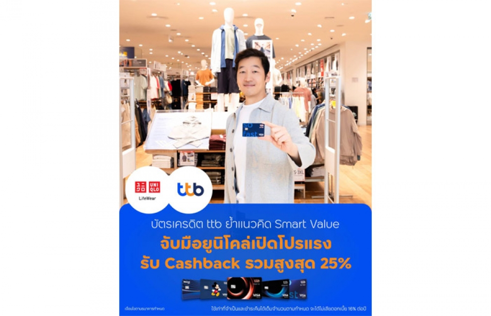 นิวส์ คอนเน็คท์ - บัตรเครดิต TTB จับมือ ยูนิโคล่ ประเทศไทย มอบโปรโมชันรับเครดิตเงินคืนรวมสูงสุด 25% ตอกย้ำทิศทางการทำตลาดบัตรเครดิตที่มุ่งสร้างความแตกต่างให้ลูกค้าได้รับความคุ้มค่าที่มากกว่า ภายใต้กรอบความคิด “Smart Value” ที่ออกแบบความคุ้มค่าให้เรียบง่าย ชัดเจน จับต้องได้จริงในทุกการใช้จ่าย