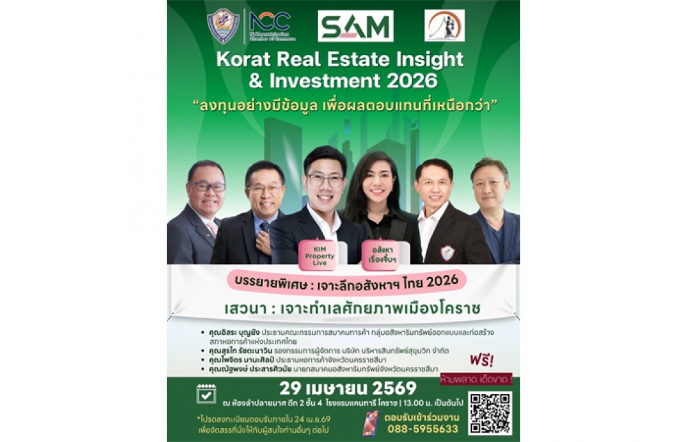 นิวส์ คอนเน็คท์ - บริษัท บริหารสินทรัพย์สุขุมวิท จำกัด หรือ บสส. (SAM) ร่วมกับ หอการค้าจังหวัดนครราชสีมา สมาคมอสังหาริมทรัพย์จังหวัดนครราชสีมา และสภาหอการค้าแห่งประเทศไทย เชิญชวนนักลงทุน ผู้ประกอบการด้านอสังหาริมทรัพย์ นายหน้า นักลงทุนรายย่อย รวมถึงประชาชนผู้สนใจในจังหวัดนครราชสีมาและจังหวัดใกล้เคียง เข้าร่วมงานสัมมนาด้านอสังหาริมทรัพย์ครั้งสำคัญแห่งปี “Korat Real Estate Insight & Investment 2026” ภายใต้แนวคิด “ลงทุนอย่างมีข้อมูล เพื่อผลตอบแทนที่เหนือกว่า” ใน วันพุธที่ 29 เมษายน 2569 ตั้งแต่เวลา 13.00 น. เป็นต้นไป ณ ห้องลำปลายมาศ ชั้น 4 โรงแรมแคนทารี โคราช