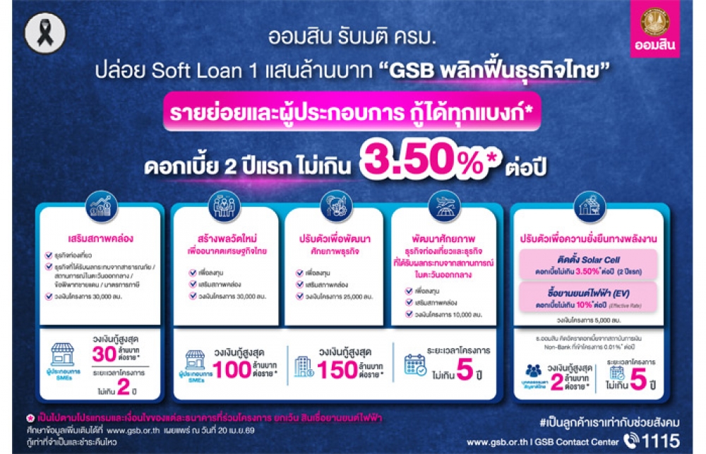 เมื่อวันที่ 20 เมษายน 2569 นายทรงพล ชีวะปัญญาโรจน์ ผู้อำนวยการธนาคารออมสิน เปิดเผยว่า ตามมติคณะรัฐมนตรี เมื่อวันที่ 11 เม.ย. 2569 เห็นชอบการออกมาตรการดูแลผู้ที่ได้รับผลกระทบจากสถานการณ์วิกฤตพลังงาน ความไม่แน่นอนทางเศรษฐกิจและความขัดแย้งในต่างประเทศ โดยมอบหมายให้ธนาคารออมสินเป็นแกนหลักในการขับเคลื่อนมาตรการทางการเงินเพื่อเติมสภาพคล่องผ่าน โครงการสินเชื่อดอกเบี้ยต่ำ (Soft Loan) “GSB พลิกฟื้นธุรกิจไทย” วงเงิน 100,000 ล้านบาท มุ่งช่วยประชาชนและผู้ประกอบการ SMEs ปรับตัวรับมือวิกฤตที่ส่งผลกระทบต่อการดำรงชีวิตและการดำเนินธุรกิจ พร้อมสนับสนุนการเปลี่ยนผ่านสู่การใช้พลังงานทางเลือก โดยความร่วมมือของธนาคารพาณิชย์และสถาบันการเงินเฉพาะกิจทั้ง 16 แห่ง ในการส่งผ่านเงินทุนดอกเบี้ยต่ำไปยังกลุ่มเป้าหมายให้เร็วที่สุด