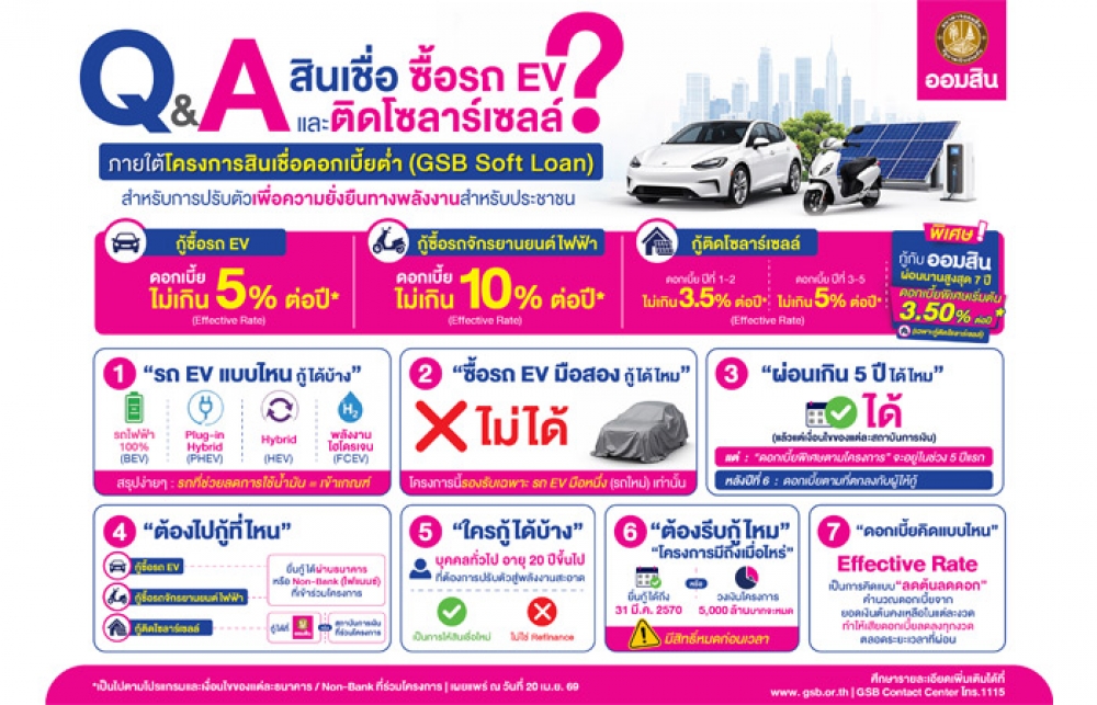 สอบถามข้อมูลโครงการสินเชื่อดอกเบี้ยต่ำ Soft Loan GSB พลิกฟื้นธุรกิจไทย (โครงการย่อยกรณีปรับตัวเพื่อความยั่งยืนทางพลังงานสำหรับประชาชน – ติดตั้งโซลาร์เซลล์ และ จัดซื้อยานยนต์ไฟฟ้า) ได้ที่ธนาคารออมสิน GSB Contact Center โทร. 1115 และศึกษาข้อมูลเพิ่มเติมได้ที่