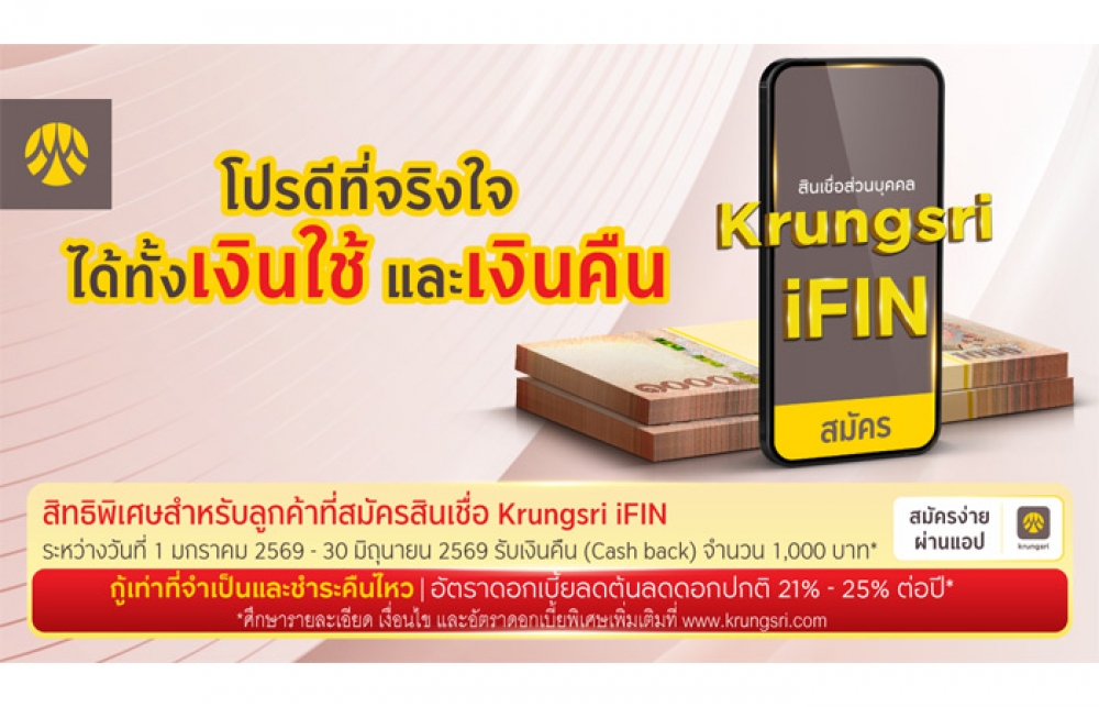 กรุงศรีมอบเงินคืน 1,000 บาท เมื่อสมัครสินเชื่อ Krungsri iFIN